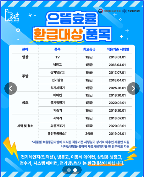 - 대상 품목: 냉장고, 세탁기, 에어컨, 건조기, TV, 제습기 등 에너지소비효율 1등급 가전
